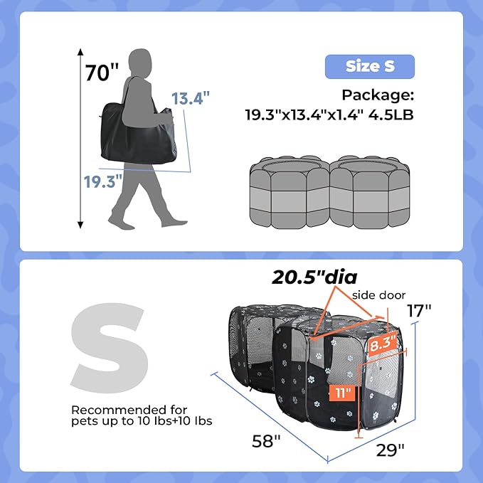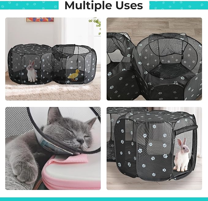 - 【Instant Setup, 2-in-1 Spacious】Pop-open rectangular or octagonal design playpen that require zero assembly – simply unfold within seconds. When need to store it, the collapsible playpen folds flat easily and stored into a compact carry case, making it ideal for indoor/outdoor use. The spacious 2-in-1 design gives more space for small animals to roam.