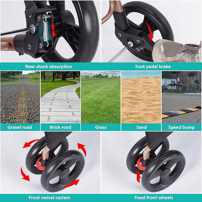 - 360° Smooth-Rolling Lockable Wheels: Glide effortlessly with robust 360° swivel front wheels for nimble turns, paired with sturdy lockable rear wheels for stability on rough terrain. Enjoy a smooth ride in parks, streets, or crowded spaces.