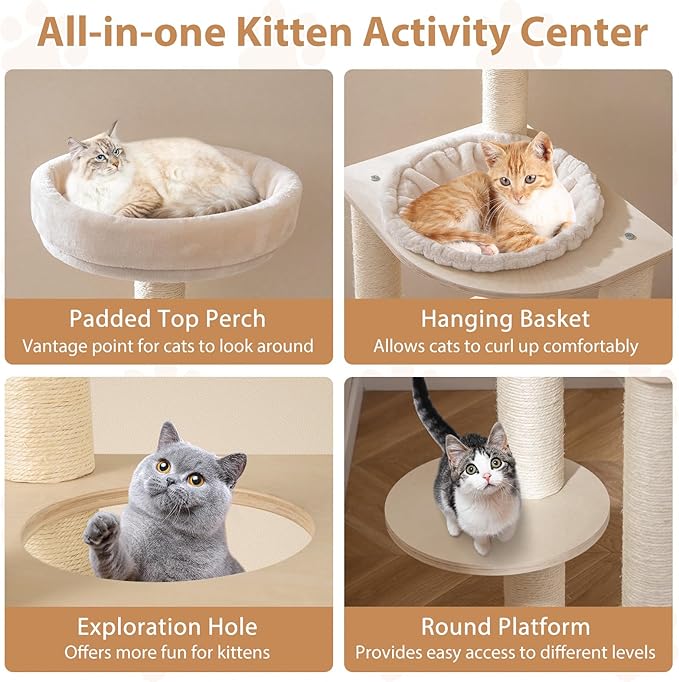 - Multi-Level Excitement: Featuring 6 climbing levels, the modern cat tree allows your pet to access a comfortable top perch for observation, a serene hammock for lounging, and 2 fun cat holes for exploration. Designed to save space, the multi-level kitty activity center is perfect for snug corners.