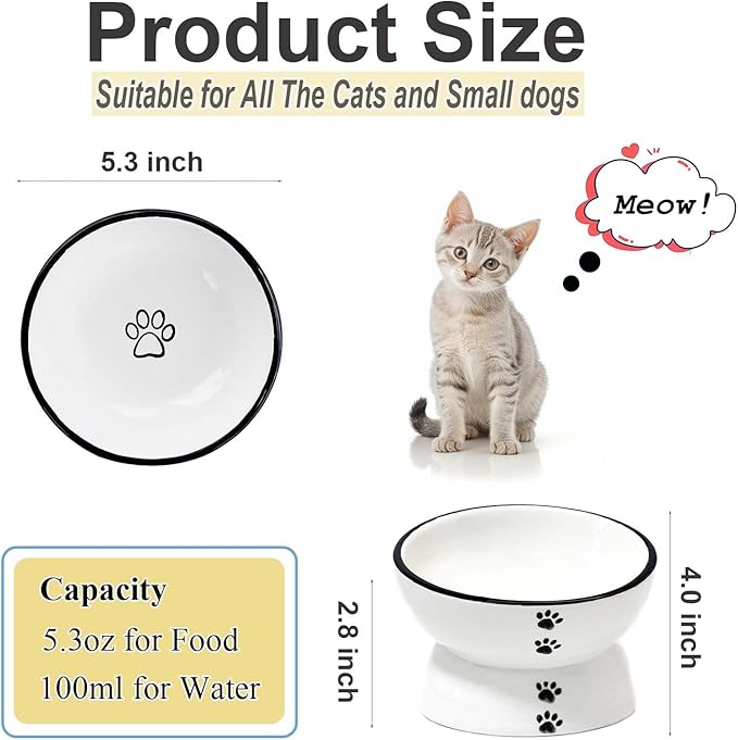 • 【Material & Easy Care】 Cat feeding bowl is made of premium odorless ceramics, giving your cat a clean eating environment. With a smooth glaze that makes it easy to clean, can be washed by hand and dishwasher.