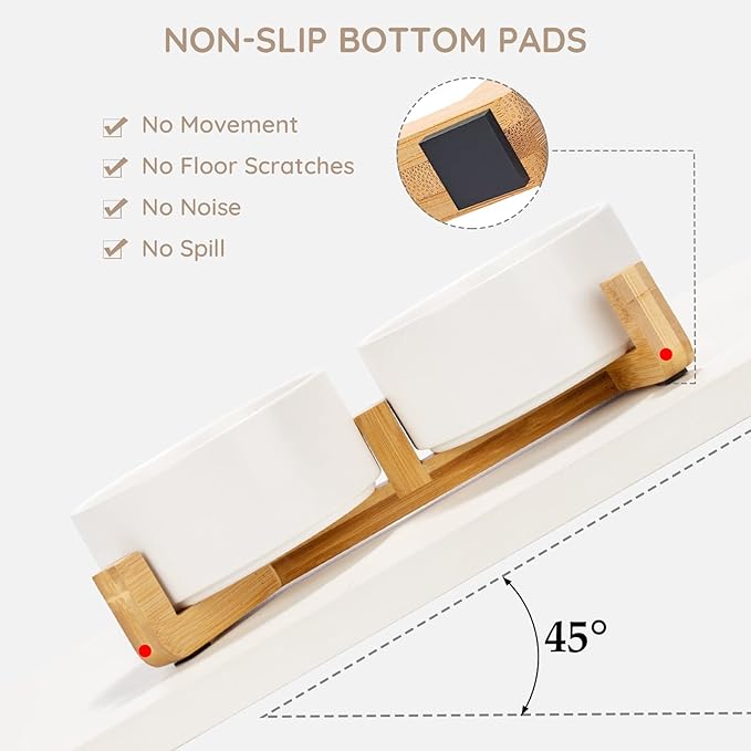 • [Double Bowl Design]:One dog bowl for food and one for water, Each ceramic pet bowl has a Unique wooden stand, raising the dishes closer to your pet for more comfortable eating