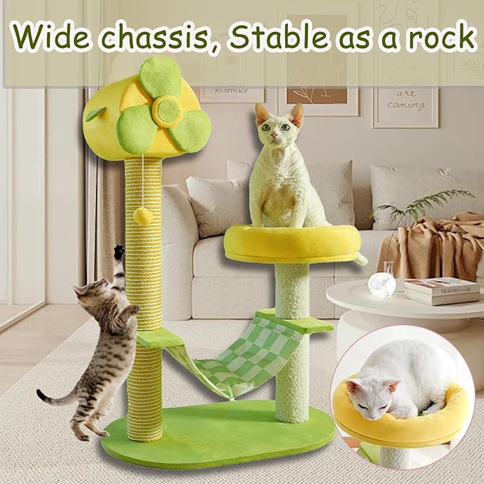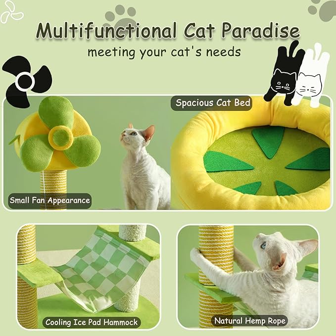 - 【Multifunctional Summer Fan-Themed Indoor Cat Tree】This multifunctional cat tree combines a playful fan-shaped design with practical features: it includes a sisal scratching post, a cooling hammock, a plush bed, and interactive plush ball toys. It satisfies your cat's instinctual needs for scratching, playing, resting, and cooling off. The vibrant yellow-green color scheme also adds a splash of color to your home decor
